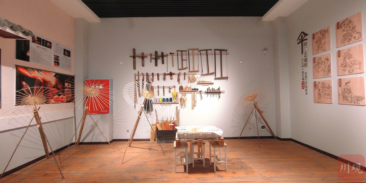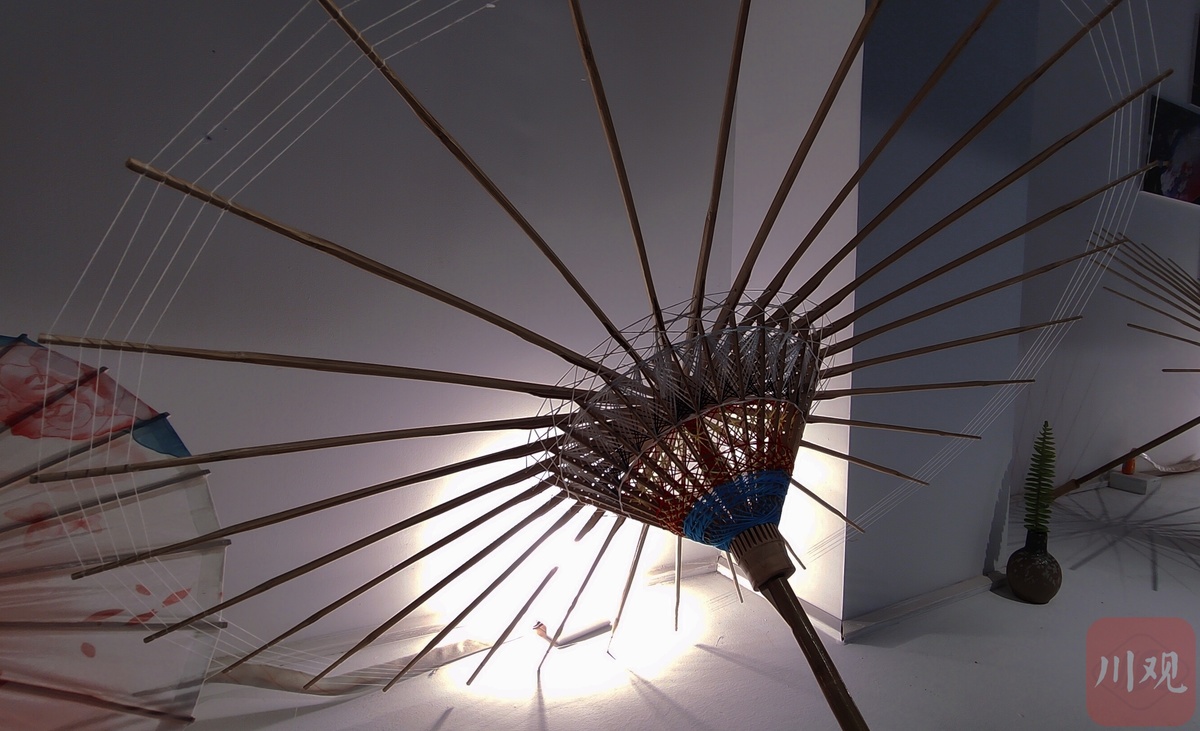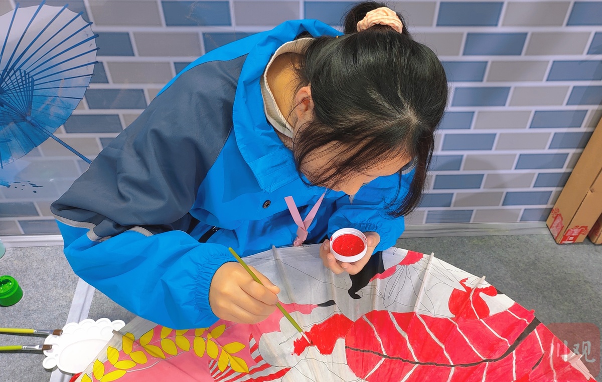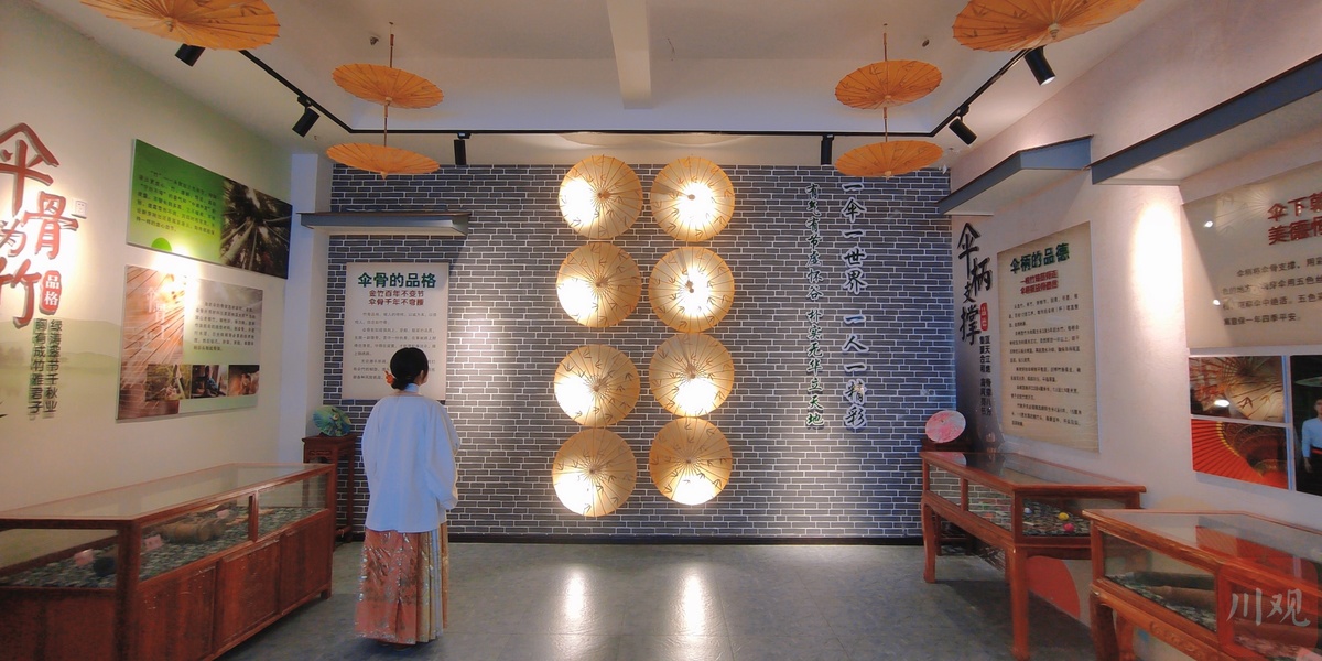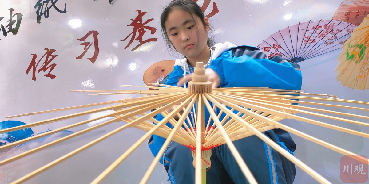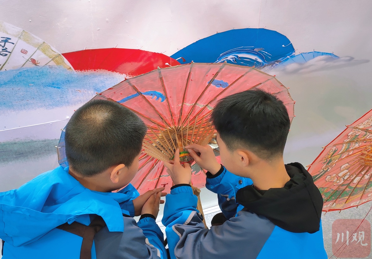 伞里之所以叫“伞里”,其中的伞正是指国家非物质文化遗产——分水岭镇油纸伞原产地。整条伞里古街四处可见油纸伞的装饰物,或大或小。在这次活动中,来自江阳区分水岭镇初级中学校的初一初二年级的学生,就在现场手工绘制油纸伞面,为油纸伞穿线,动作娴熟。