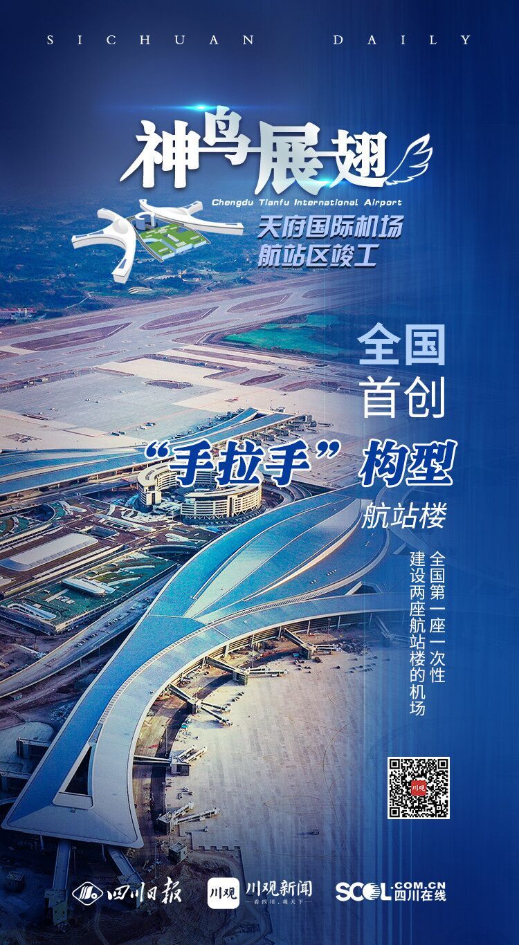 ●机场航站楼造型为全国首创的“手拉手”构型,这也使得天府国际机场成为全国首座一次性建设两座航站楼的机场。