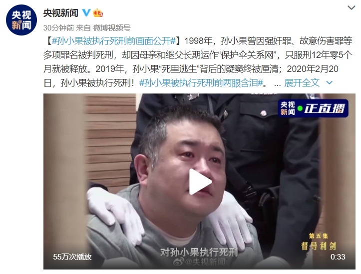 【孙小果被执行死刑前画面公开】1998年,孙小果曾因强奸罪、故意伤害罪等多项罪名被判死刑,却因母亲和继父长期运作“保护伞关系网”,只服刑12年零5个月就被释放。2019年,孙小果“死里逃生”背后的疑窦终被厘清。2020年2月20日,孙小果被执行死刑!