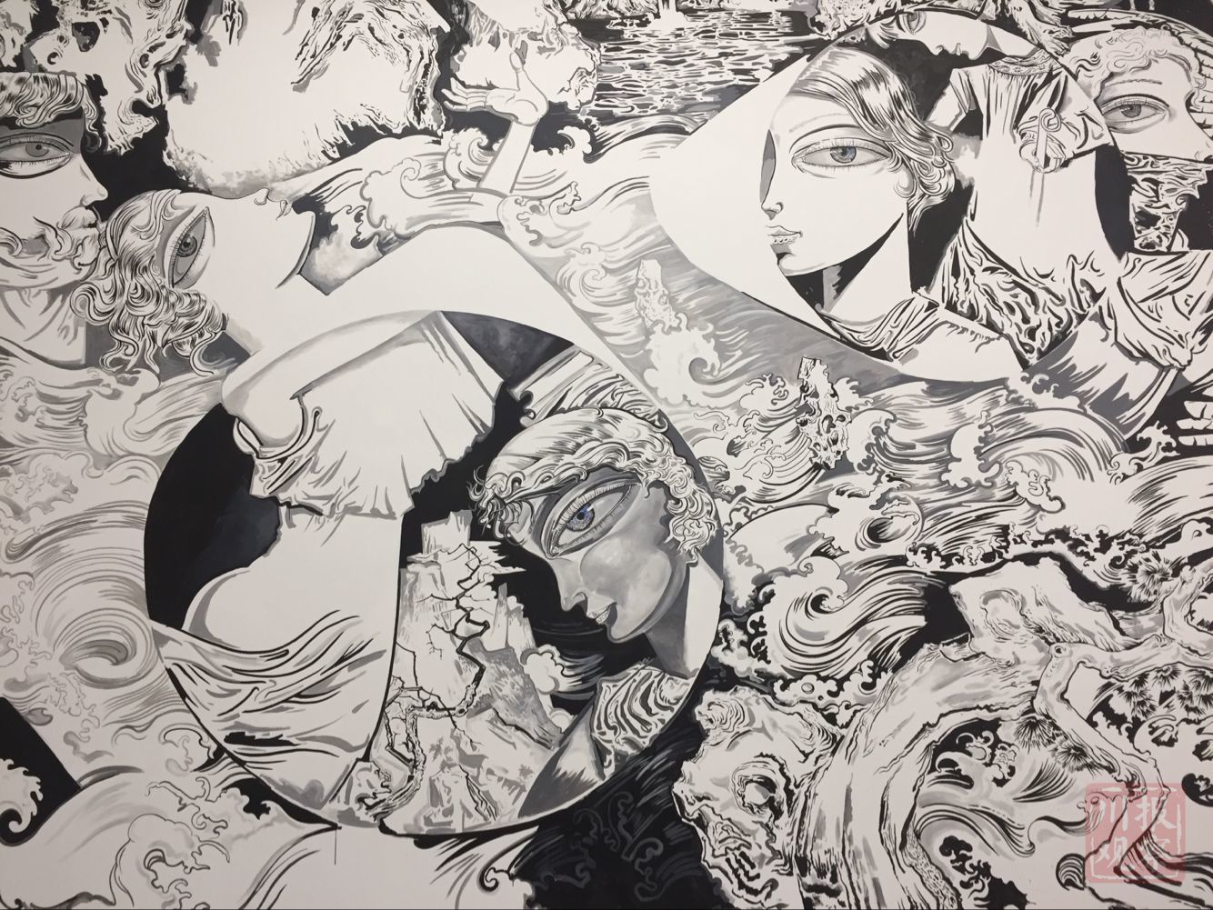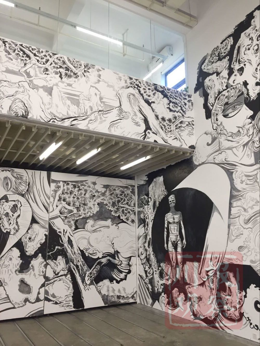 走进展厅,熊宇为此次展览所绘的墙面创作引人注目,总长度超过6米、高约3米。画面采用了黑白色调,融合了假山、植物、卡通人物、波浪等熊宇绘画中常见的形象。“我把这些元素融合在一起,它们反复循环,形成流动的节奏并成为整体。”