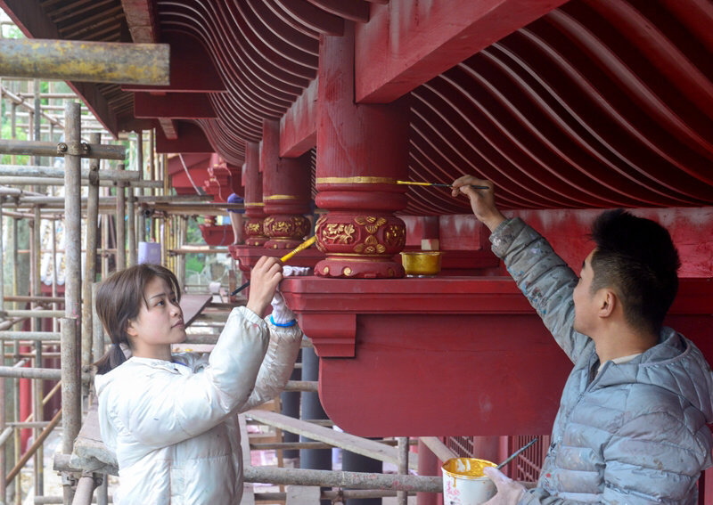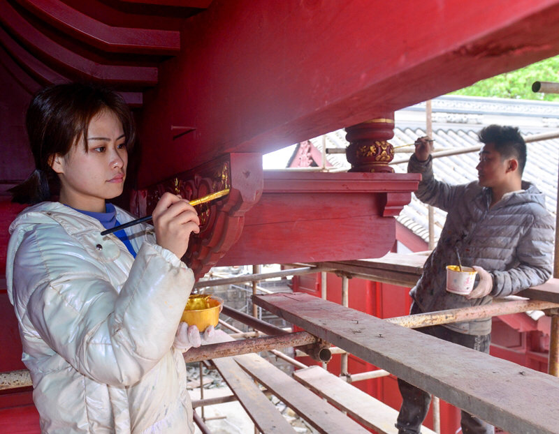 或是站在脚手架上,或是半蹲着门窗前,一手端着颜料,一手拿着画笔,神情专注地在古建筑的门窗雕花上一笔一笔地描绘着……3月31日,在南充市蓬安县相如故城,一群90后画师们正在朝阳的照耀下,细腻地辗转手笔,为文庙彩绘描金。