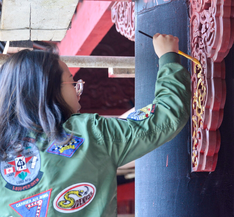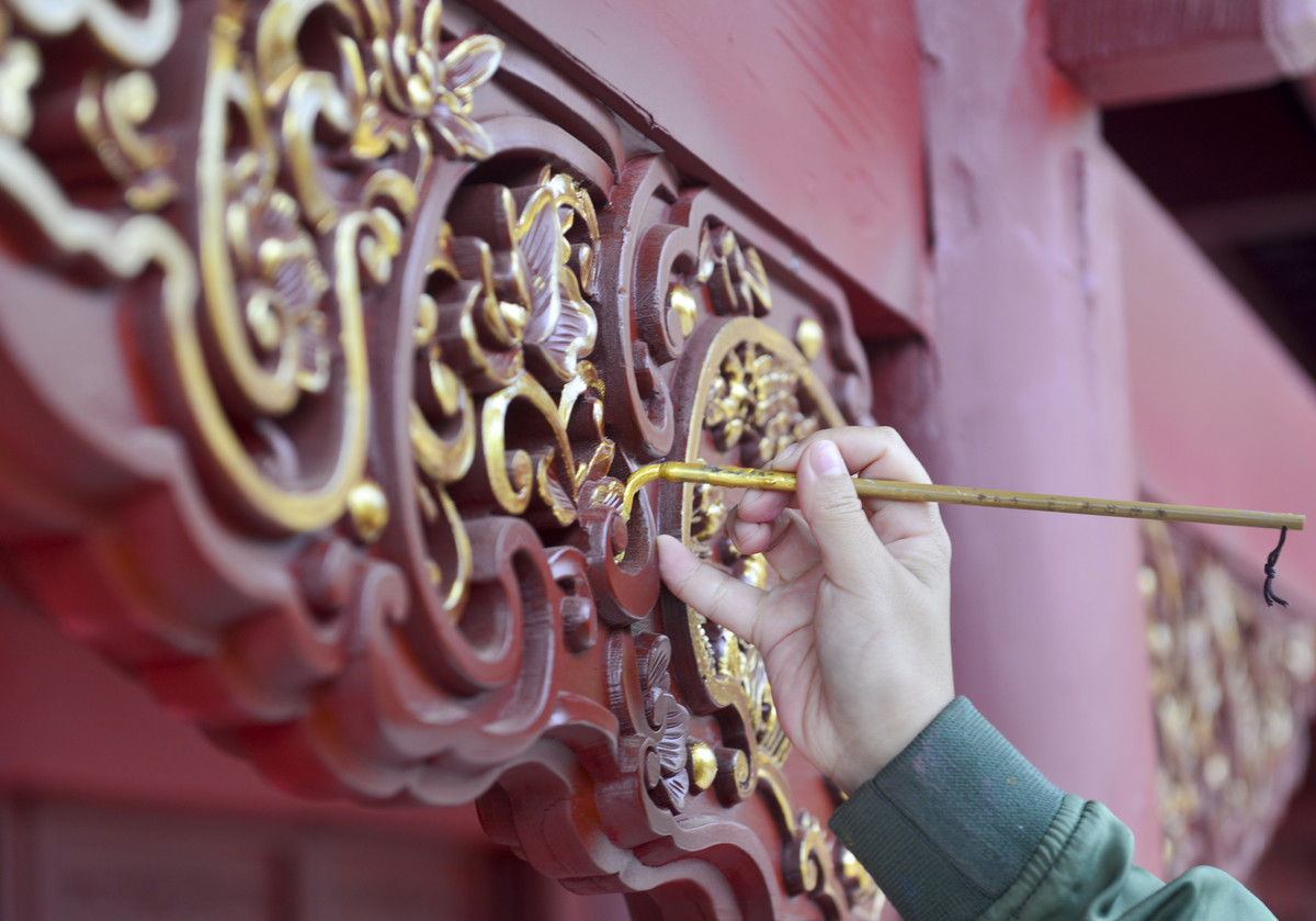 “最好的古建修复和保护就是让古建恢复原貌,透着传统气息,品起来原汁原味。描金这项工作没有创作可言,就是一笔一画的重复。”一小时后,一处挂落的描金工作完成,只见杜梦婷从脚手架上下来,仔细查看了这一处挂落上的描金,确定没有问题后,甩了甩有些发僵的手臂,收拾好颜料画笔,准备转战下一处。