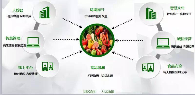 “智慧农贸市场”是指通过物联网、云计算、大数据等技术对传统的菜市场进行升级改造,解决食品溯源、智能电子支付等问题,在实现关注食品安全、保护消费者权益、方便消费购物的同时,提升市场管理水平,其具有针对性定制的功能模块,充分实现了信息的实时化、具体化、可视化。