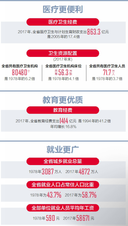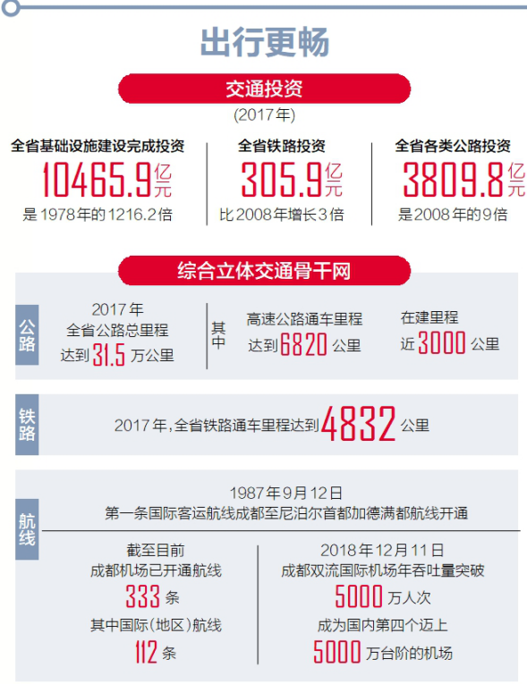 过去40年,四川经济总量实现了从百亿到千亿再到万亿,甚至逼近四万亿的历史性跨越,人均GDP从1978年的261元到2017年的44651元,地方一般公共预算收入从每年不足40亿元跃升到3579.8亿元。在从经济大省向经济强省的跨越中,川人靠奋斗创造了巨大的物质财富。
