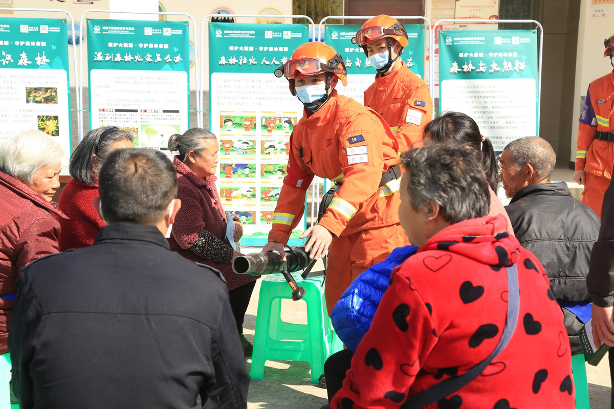 队伍指战员深入都江堰青城山社区、赵公山社区、白马社区,大邑县花水湾镇、斜源小学等地,通过悬挂横幅、陈列展板、现场讲解等方式开展防火宣传教育,发放宣传资料,为村民宣讲森林防火知识,并展示灭火装备,让群众体验装备功能。