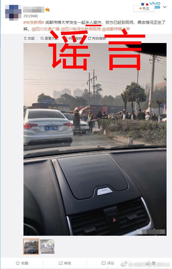 经查,亦有网民在“百度贴吧-成都传媒大学”发表相关帖子称:“学校杀人了。”成都网警随即向属地公安@郫都公安 核实,照片中事件实为17日发生在学校附近的车祸,被杜撰成杀人案件。网传为谣言,请勿造谣传谣!