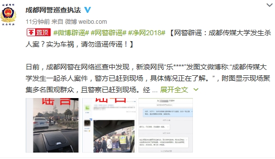 12月19日,成都网警巡查执法官方微博发布通报:近日,成都网警在网络巡查中发现,新浪网民“乐****”发图文微博称:“成都传媒大学发生一起杀人案件,警方已赶到现场,具体情况正在了解。”,附图显示现场聚集多名围观群众,且警察已赶到现场。