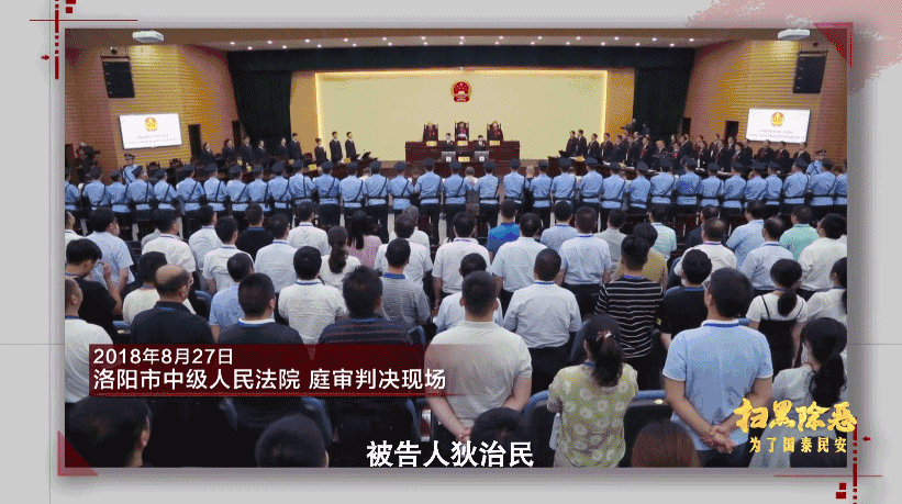 2018年8月27日 洛阳市中级人民法院审判现场:被告人狄治民犯组织、领导黑社会性质组织罪,判处有期徒刑22年,剥夺政治权利5年,并处没收个人全部财产。
