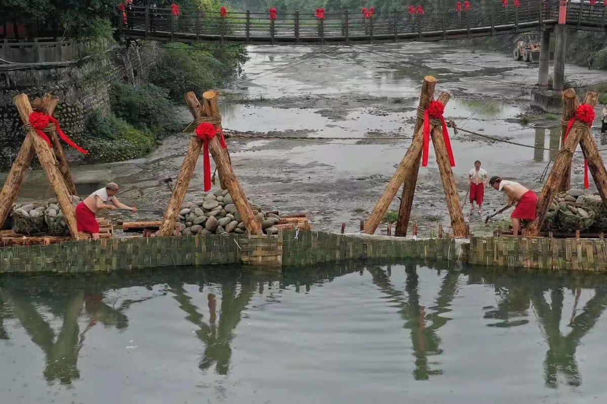 放水大典现场,众人礼拜先贤。“砍杩槎——放水—— ”随着主祭官一声令下,一群青壮男子在一个个杩槎结口前举起利斧,奋力砍断岁修时筑起的杩槎上的竹索,另一群壮士奋力拉动绳索放倒杩槎,滚滚岷江水如万马奔腾,从源头倾泻而下,千里清流灌向广袤的成都平原。