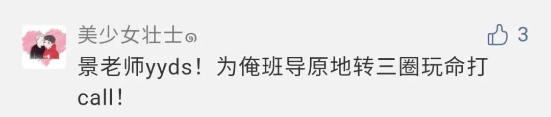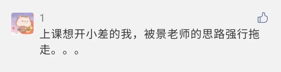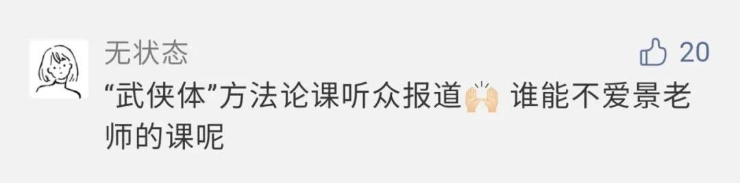 在揭秘这位老师是谁前,先通过一波学生评价感受下他的魅力。曾上过他课的学生表示:“景老师yyds(永远的神)!为俺班导原地转三圈玩命打call!”“‘武侠论体‘方法论课听众报道,谁能不爱景老师的课呢!”,还有大型“真香现场”,学生直言“不是我说,上课真香”。