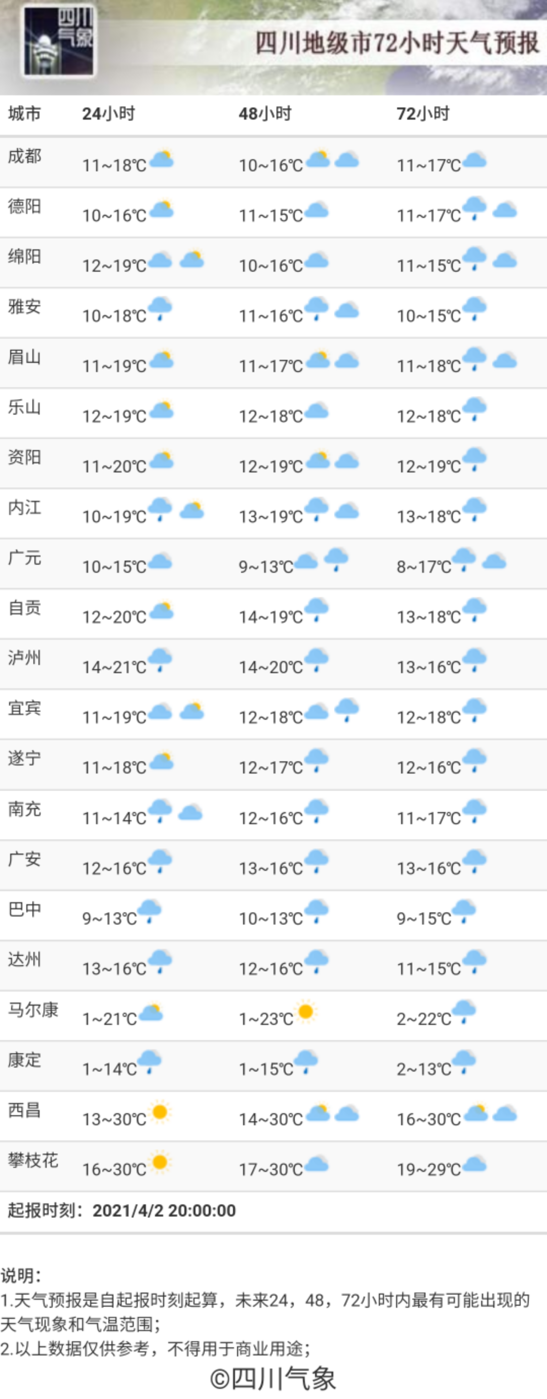 而今天(4月2日)下午14时,除广元、遂宁、达州、南充、广安、巴中比昨天更低外,全省其余市州都与前一日的气温有所上升或持平。