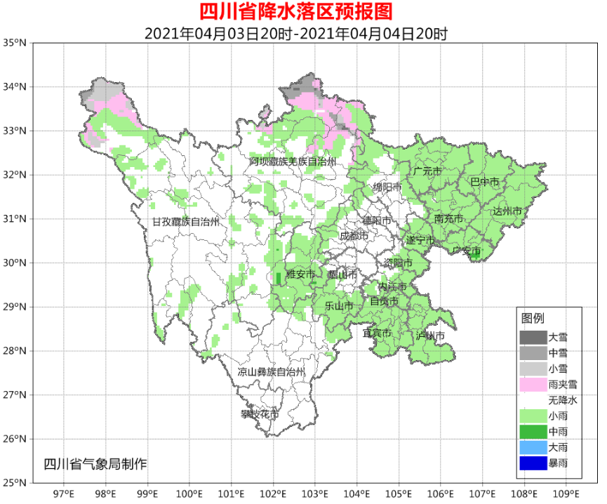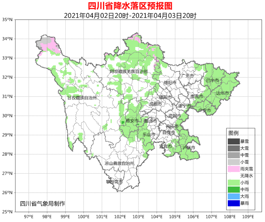 今天晚上到明天(4月3日)白天,巴中、达州、南充、广安、泸州5市以及盆地西部沿山阴天有小雨或阵雨,盆地其余地方阴天间多云;甘孜州西北部和阿坝州的部分地方多云间阴有分散阵雨(雪),川西高原其余地方和攀西地区晴间多云。