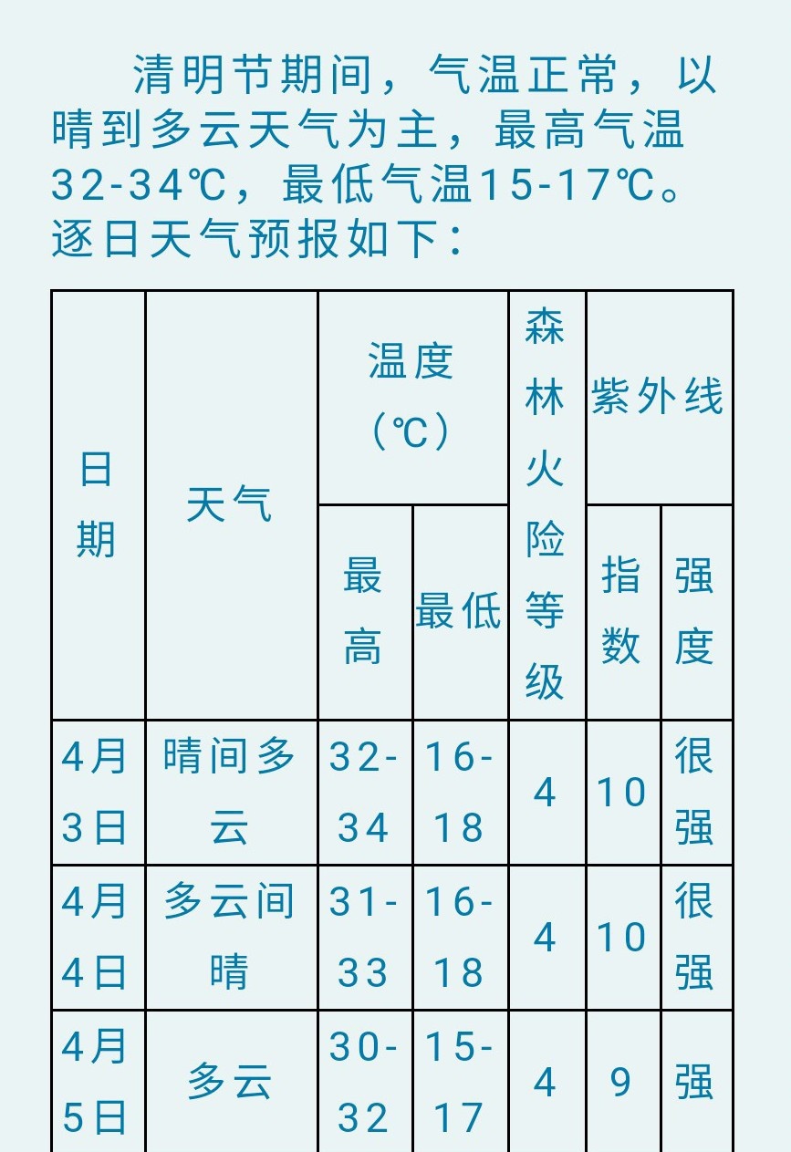 各区县清明节前期(4月3日)阴天间多云,后期(4月4日到5日)以阴天为主,早晚有分散性零星小雨,气温略降,清明节期间降雨总体偏弱,森林火险气象等级普遍为3级,易引发森林火情火灾。