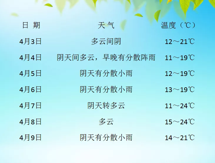 4月2日夜间到4月3日白天,全市24小时内最低气温10~12℃,最高气温17~19℃。