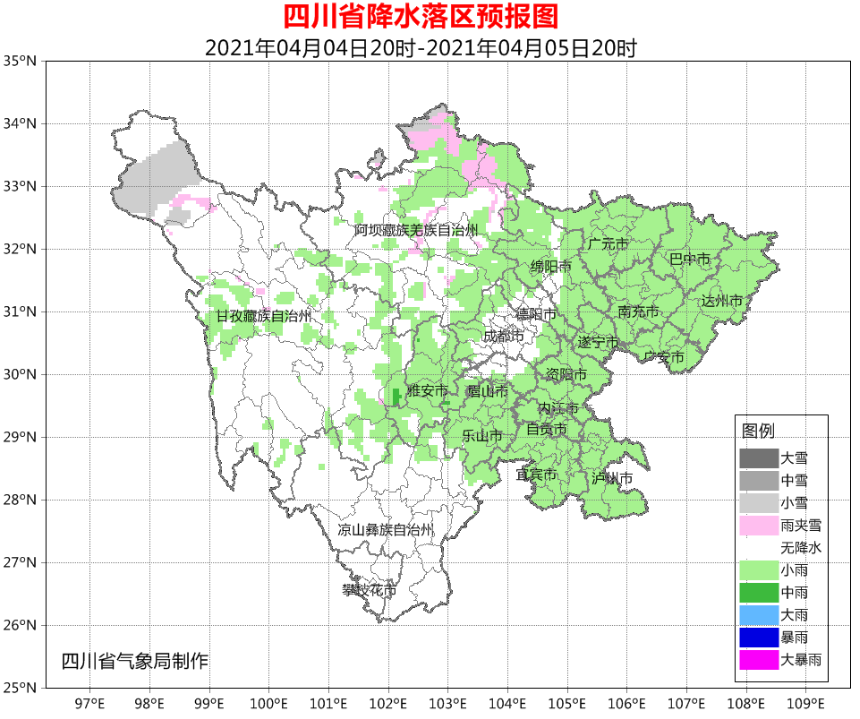 4月4日晚上到5日白天,盆地各市阴天间多云,部分地方有阵雨或小雨;甘孜州和阿坝州的部分地方多云间阴有分散阵雨(雪),攀西地区多云。
