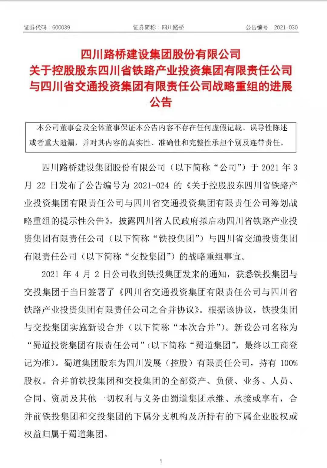 四川路桥公告透露,4月2日公司收到铁投集团发来的通知,获悉铁投集团与交投集团于当日签署了《四川省交通投资集团有限责任公司与四川省铁路产业投资集团有限责任公司之合并协议》。根据该协议,铁投集团与交投集团实施新设合并(以下简称“本次合并”)。新设公司名称为“蜀道投资集团有限责任公司”(以下简称“蜀道集团”,最终以工商登记为准)。蜀道集团股东为四川发展(控股)有限责任公司,持有100%股权。合并前铁投集团和交投集团的全部资产、负债、业务、人员、合同、资质及其他一切权利与义务由蜀道集团承继、承接或享有,合并前铁投集团和交投集团的下属分支机构及所持有的下属企业股权或权益归属于蜀道集团。