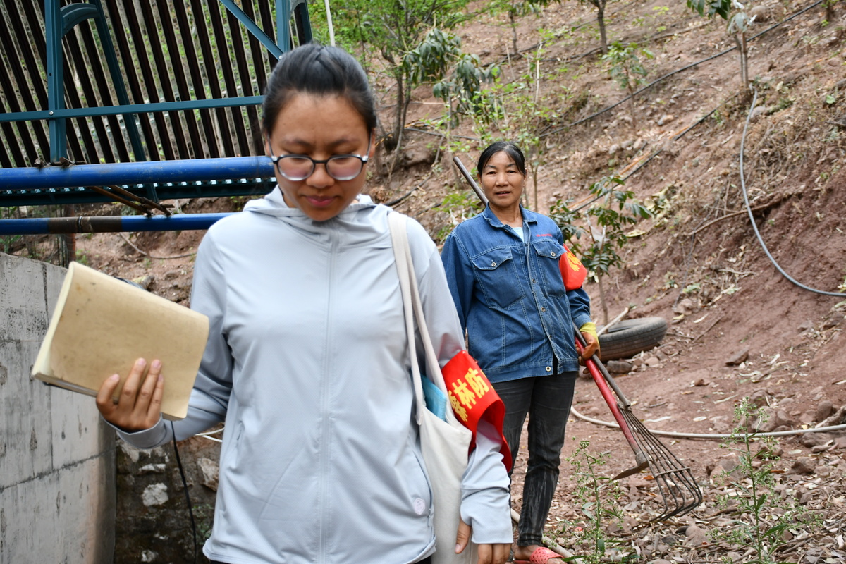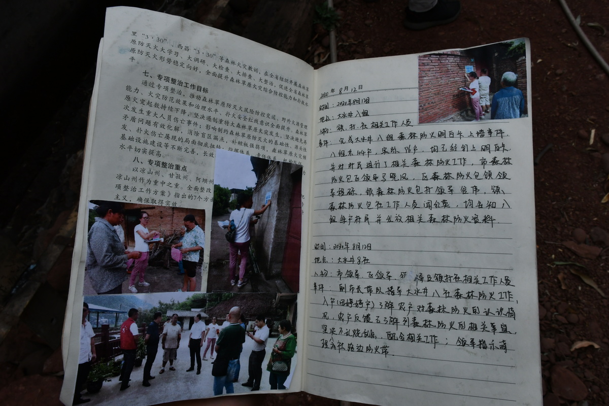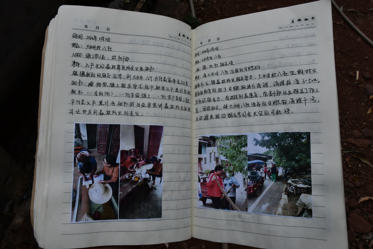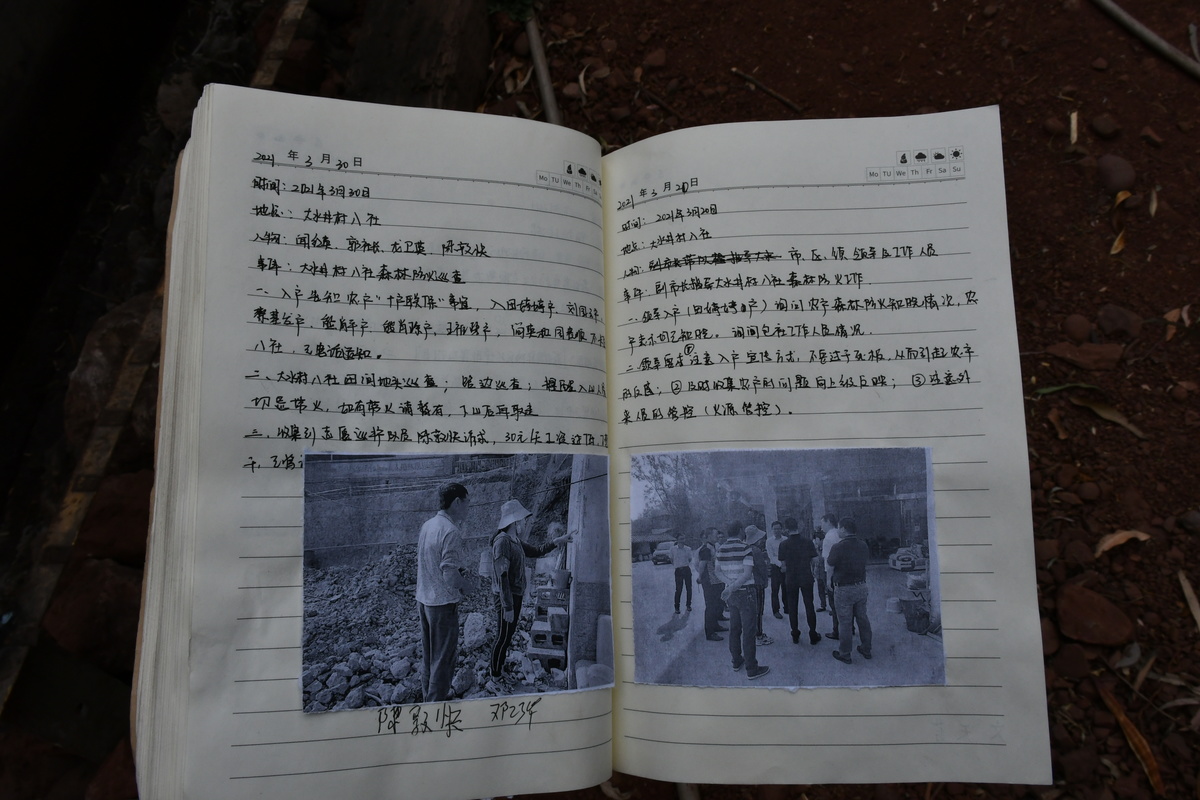 除了进村入户的“标配”装备——运动鞋、防晒衣,她的手上还拿着一个淡黄色封面的森林防火工作记录本。“我们包保责任人人手一本,记录我们责任履行情况。”