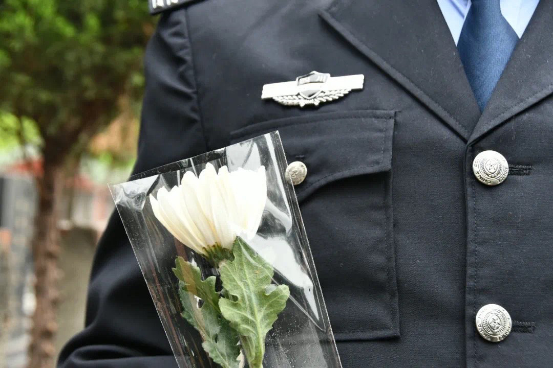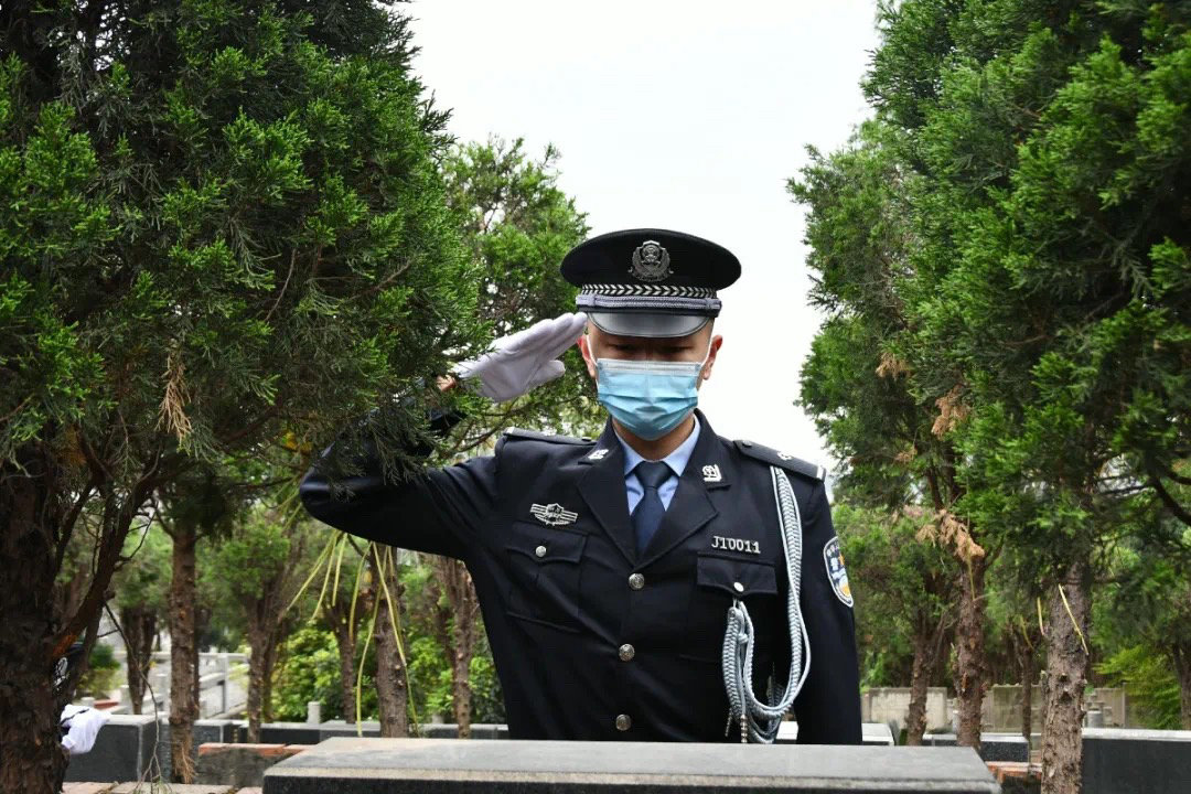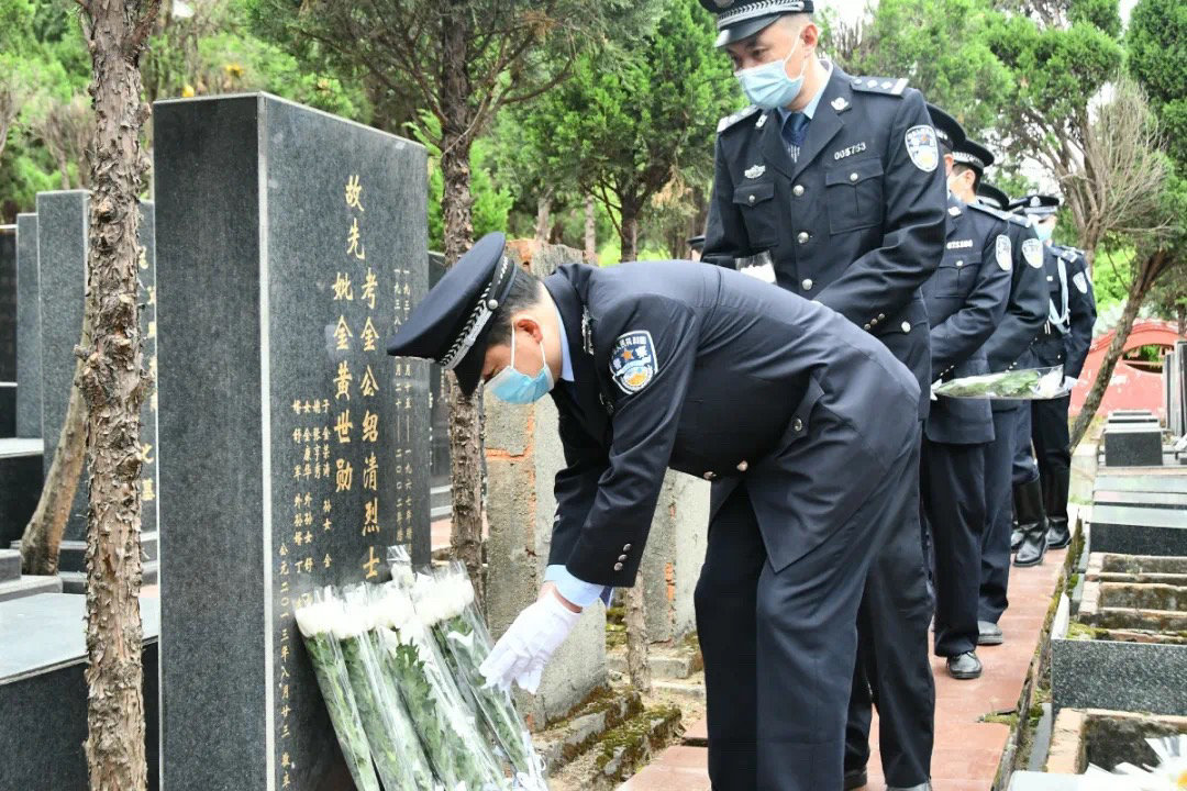 青山不语,松柏苍翠。在庄严肃穆的氛围中,民警代表怀着无比崇敬的心情向分局英烈金绍清同志敬献鲜花,表达对英烈的深切哀思和不负重托的铿锵誓言。