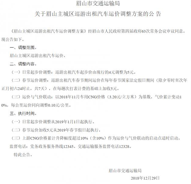 1月4日,记者从眉山市交通运输局获悉,日前,该局发布《关于眉山主城区巡游出租汽车运价调整方案》的公告。
