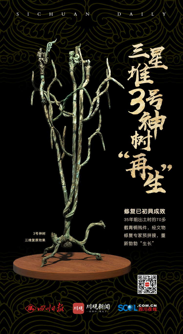 2019年,3号神树的修复获得了国家文物局划拨的修复专项资金,修复正式启动。四川省文物考古研究院、三星堆博物馆派出了文物保护团队保驾护航,文物拼接修复的工作,则主要由三星堆博物馆的文物修复专家郭汉中领衔。