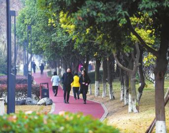 1月3日,成都市成华区杉板桥路沙河城市公园内,市民在健康步道上漫步。肖雨杨摄