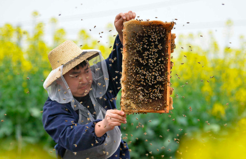 近日,广安市岳池县九龙街道高垭口村一片黄灿灿的油菜花中,来自南充市的养蜂人梁淋凯在观察蜜脾上的酿蜜和幼蜂繁殖情况。张启富 摄(视觉四川)