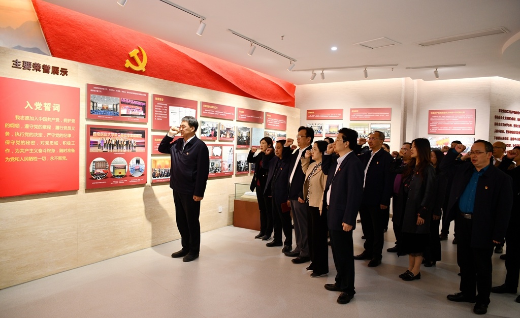 在校史馆党的建设专题前,举行了宣誓仪式,全体与会人员重温了入党誓词。