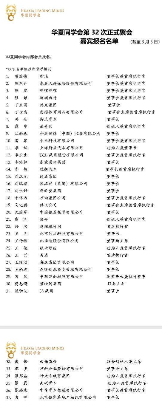 有媒体透露,大佬们齐聚一堂并不是官方活动,而是“华夏同学会第32次正式聚会”。江湖传言,华夏同学会与中国企业家俱乐部、泰山会、江南会并称为国内四大顶级神秘圈子。而今年初,泰山会向有关部门完成注销泰山会有关登记手续。据了解,华夏同学会,由在长江商学院和中欧商学院上过CEO班的同学自由组织而成,大部分都是企业家。马云、马化腾、李彦宏、刘永好、王健林、冯仑、郭广昌、李东生、柳传志等人皆是华夏同学会成员,每年聚会两次,轮流承办,每次的聚会都会有一个主题。根据初步确认的名单,参加这次聚会的大佬还有曹国伟、陈东升、冯仑、江南春、杨惠妍、姚劲波、虞锋、郁亮、左晖等。不过,没有出现马云和李彦宏的名字。