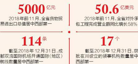 2018年四川对外开放领域成绩斐然:截至去年11月,全省货物贸易进出口总值首次站上5000亿元台阶,居中西部第一;成自宜高铁自宜段全线开工,四川畅通南向通道、深化南向开放合作取得重大进展……