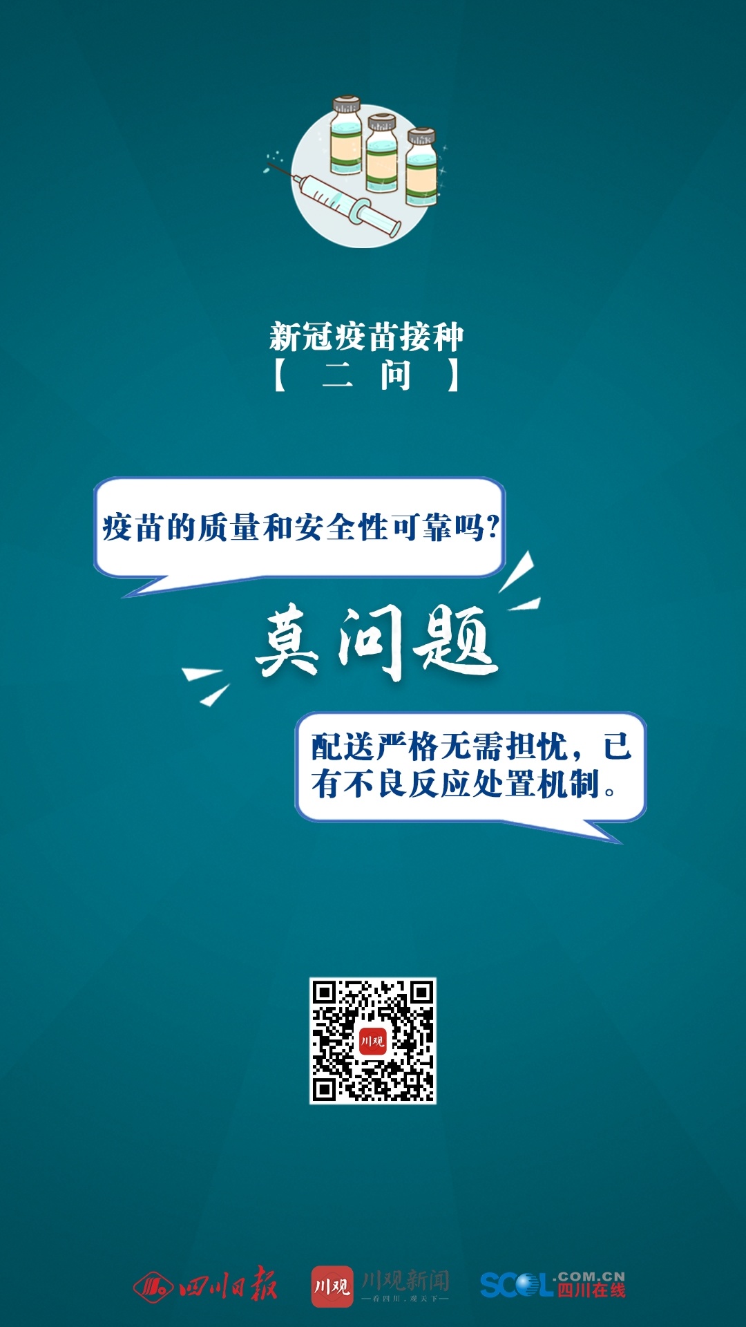周久顺表示,为做好本次新冠疫苗接种安全保障工作,四川正在采取多项措施:目前四川每个接种点都有二级以上医疗机构的现场驻点保障,熟练掌握疫苗异常反应处置措施和急救技能的保障人员随时待命。此外,接种单位就近的定点救治医院均建立了绿色通道,各地也成立了疑似预防接种不良反应调查处置小组,“通过以上措施,我们会尽最大努力来保证群众的接种安全。”