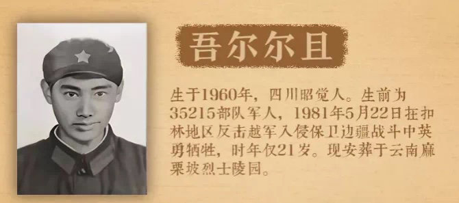 在吾尔尔且烈士的五弟家,弟媳阿西史里说,吾尔尔且是他们的大哥,当年参军后在一次战斗中光荣牺牲。目前家里只剩下珍藏的吾尔尔且的相关证件、照片以及三等功奖章。在吾尔尔且的立功受奖证书上,清楚记录着吾尔尔且的主要事迹:一九八一年五月扣林反击越军入侵保卫边疆战斗中,吾尔尔且服从命令、听指挥、不怕艰难困苦,不怕流血牺牲,战斗英勇顽强,五月二十二日,战斗打响后,尔且烈士和全班一起奋勇杀敌,冲锋在前,当冲到83号高地前沿战壕时,不幸壮烈牺牲,战绩显著。