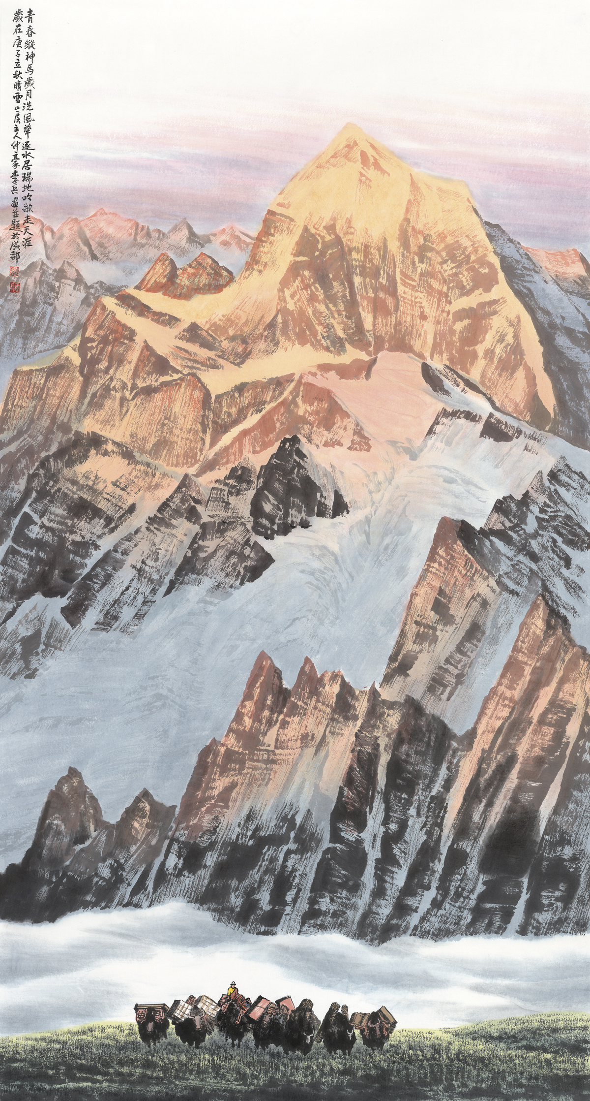 这些朴实的话语,一语点醒李兵,使得困扰他很久的画面单调问题从此大大改观。在红星路的日子,李兵的西域高原雪山画见长,并在多年的艺术实践中,笔法上逐渐形成以传统皴擦法为基础,长短斧劈皴和披麻皴相结合的一种全新的皴法——“李兵冰雪皴”,开创了冰雪山水画的新篇章。