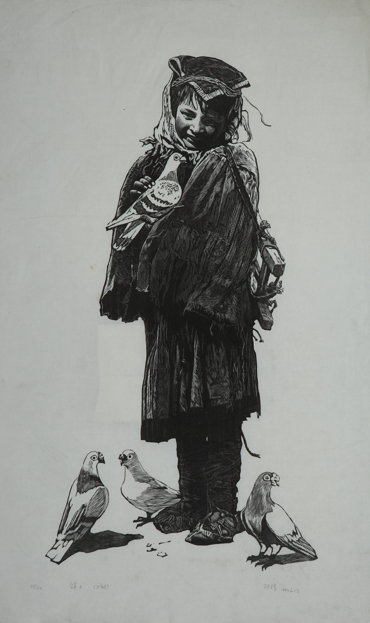 阿鸽 鸽子 黑白木刻 83×50.5cm 1984年