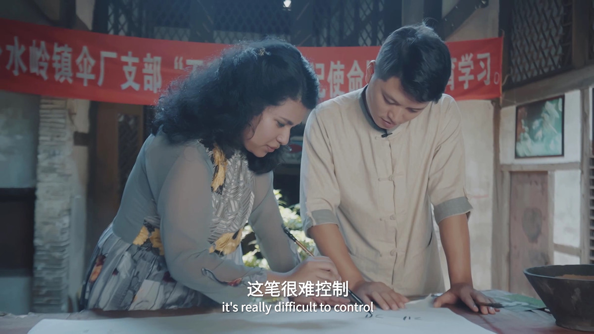 作为集工艺与文化于一体的生活艺术品,泸州分水油纸伞已有400多年历史,如何通过一个外国留学生来讲述好它的故事?在短片中,永乐寻访到国家级非物质文化遗产传承人毕六福的传人,跟随师傅亲手做了一把独具特色的熊猫图案油纸伞。“我跟着师傅做了两天,体验了画画、铺纸、刷桐油等工序,没想到一把伞的工艺如此复杂。”永乐说,做油纸伞的感觉太奇妙,每一步都要细心、耐心地完成,也深深地感受到了中华文化的博大精深,“没想到,一把小小的伞也蕴含了这么多文化与技艺。”