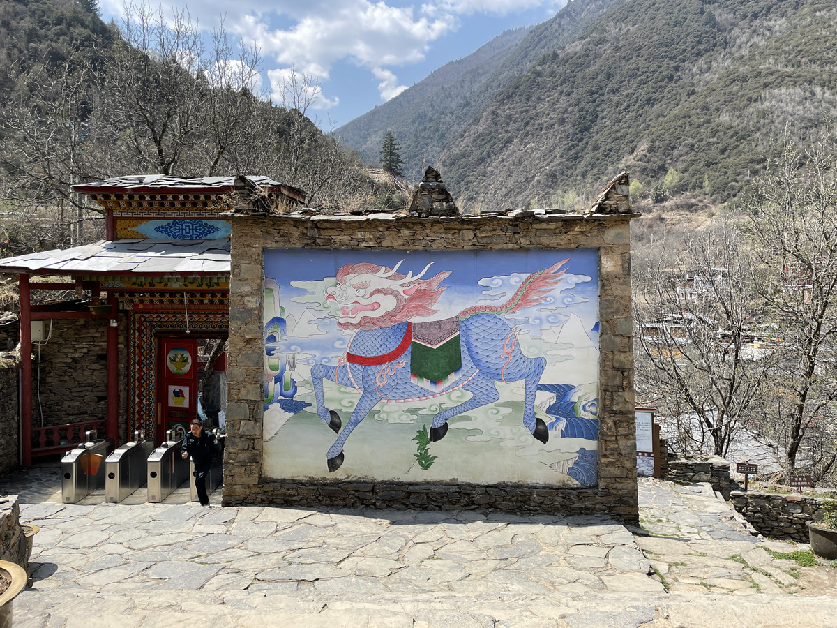 在官寨主体和大门之间,是一座正面绘老虎背面绘麒麟的藏式风格照壁。“传说官寨竣工后,从山上来了一只老虎,在大门旁边卧了一天一夜,最后悄然离去,当时的土司就命令画匠将老虎画在了照壁上。因此,卓克基这个地名除了本身的含义外,还有‘藏龙卧虎之地’的说法。而背面的麒麟则是正义的化身,警示历代土司在处理日常政务时需秉持公心。”