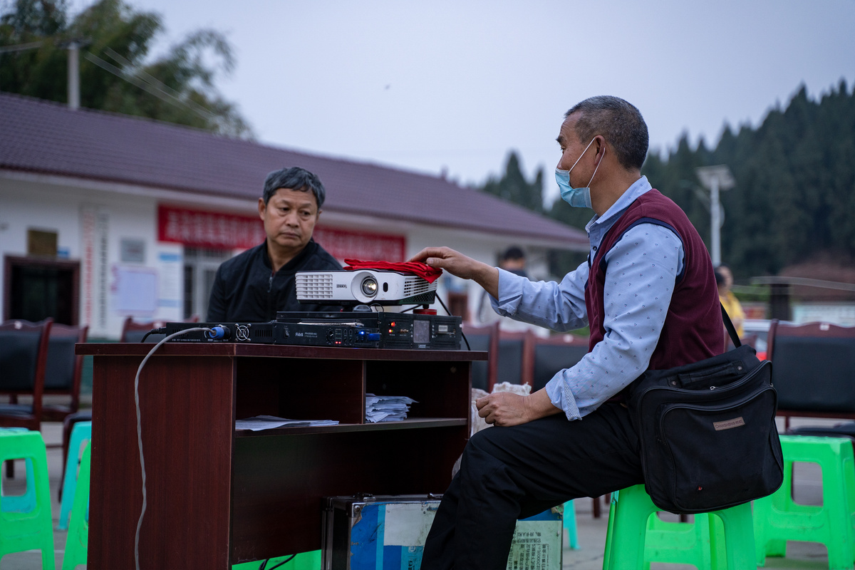 4月8日下午6点左右,内江市东兴区高梁镇鸳鸯桥村办公室外,近2000平方米的广场由沉寂变得热闹起来。流动放映车旁,一部名为《惊沙》的爱国主义题材电影正在播放,不时还有村民在广场上的书架上翻阅党史读物。