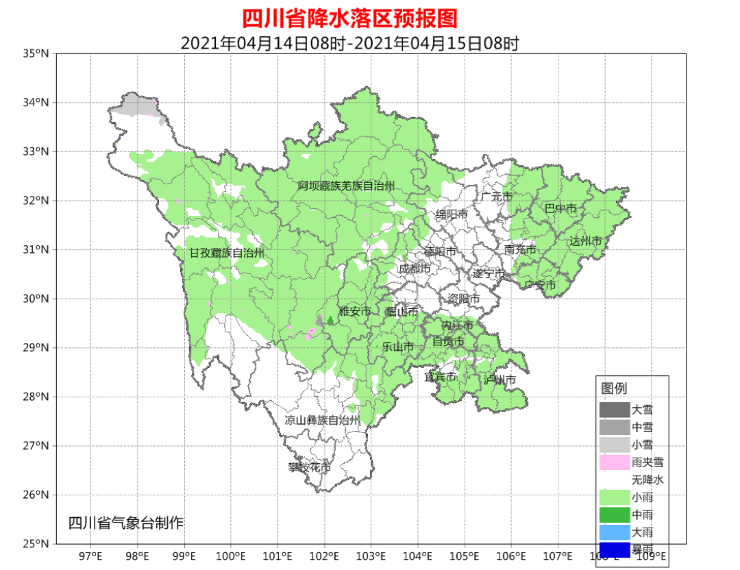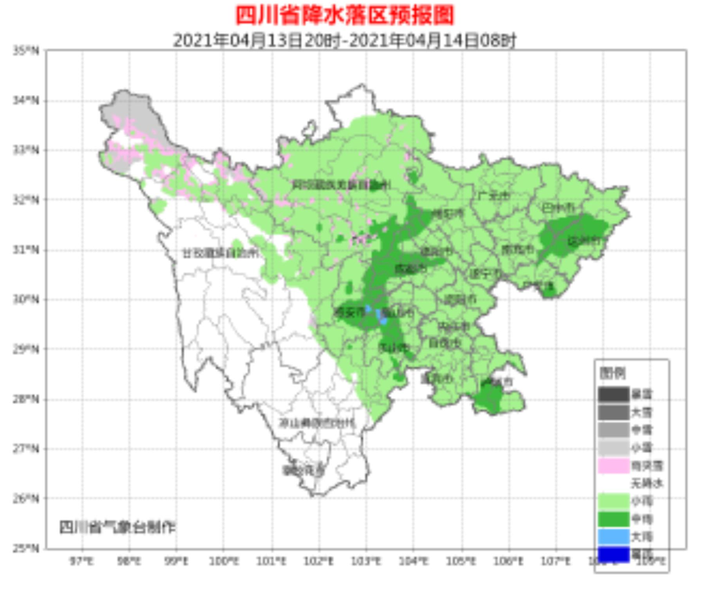 四川省气象台预计,4月14日白天到晚上,盆地大部地方阵雨转多云;川西高原大部和凉山州北部分散阵雨(雪)转晴,攀西地区其余地方以晴为主。