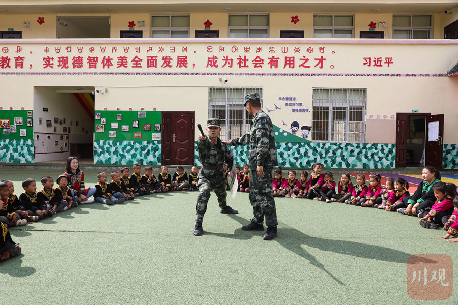 4月14日,在四川省凉山州昭觉县四开乡梭梭拉打村武警爱民幼儿园,武警官兵通过讲解国家安全知识、教授近身防身术等方式,向学生们普及国防科学知识,提高国家安全意识。