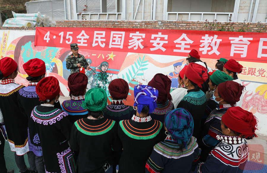 4月14日,在四川省凉山州昭觉县四开乡梭梭拉打村广场,武警官兵给彝族群众讲解国家安全知识。