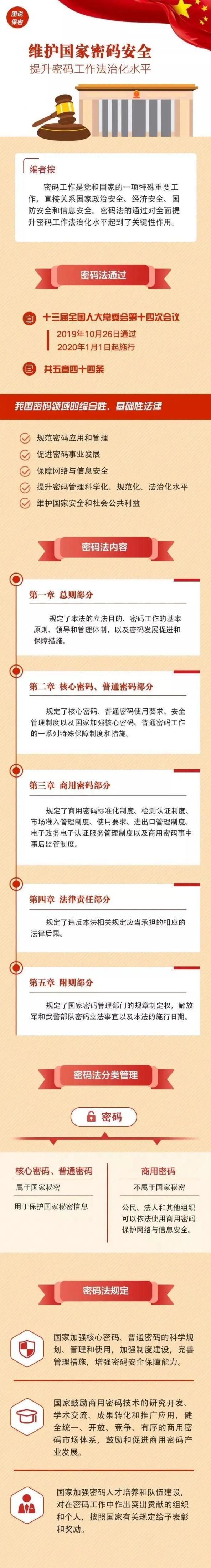 2019年10月26日,十三届全国人大常委会第十四次会议审议通过《中华人民共和国密码法》,构建国家安全法律体系的“四梁八柱”迈出重要一步,新时代密码工作法治化开启新征程。今年4月15日是第六个全民国家安全教育日,今年密码安全宣传教育活动的主题是“统筹发展与安全,筑牢维护国家安全的密码防线”。今天,四川省公安厅密码工作领导小组办公室就带大家一起了解下密码法——