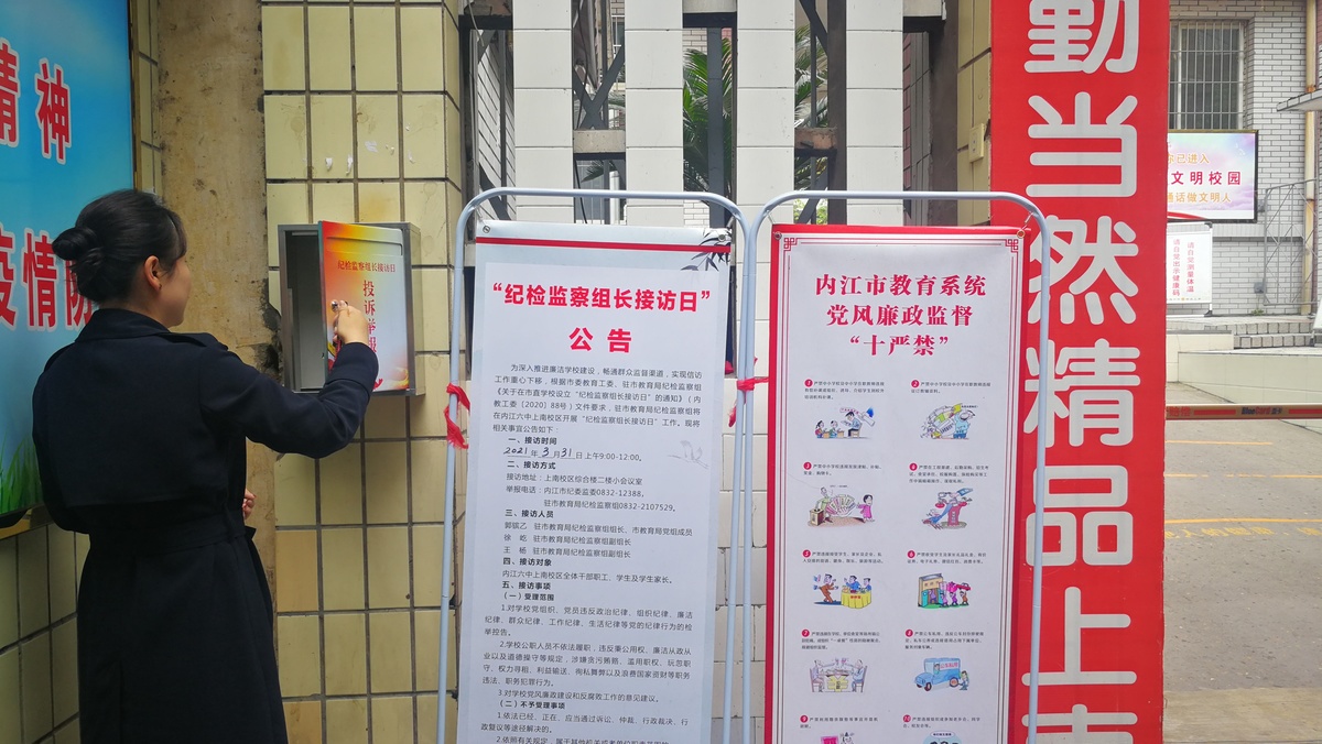 每次开展接访工作前,内江市纪委监委驻市教育局纪检监察组都会通过在到访学校的教职工微信群、LED宣传屏发布公告、在校门口摆放接访展架等形式,对接访时间、接访地点、接访事项等广而告之。