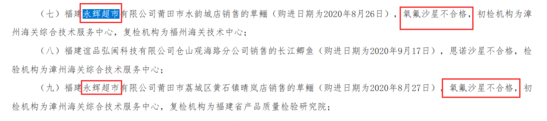 2020年1月2日和1月6日,四川永辉超市成都龙泉万达广场分公司和重庆永辉超市南坪东路分公司因为“黑鱼”、鲜鸡蛋产品的氧氟沙星不符合食品安全国家标准规定,分别被四川省市场监督管理局、重庆市市场监督管理局“点名”。