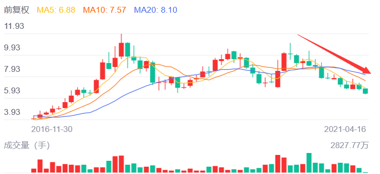 数据显示,近一年来永辉超市股价持续低迷。从2020年4月最高的11.2元,下跌到本周五也就是4月16日的6.38元,近一年跌幅高达43%!