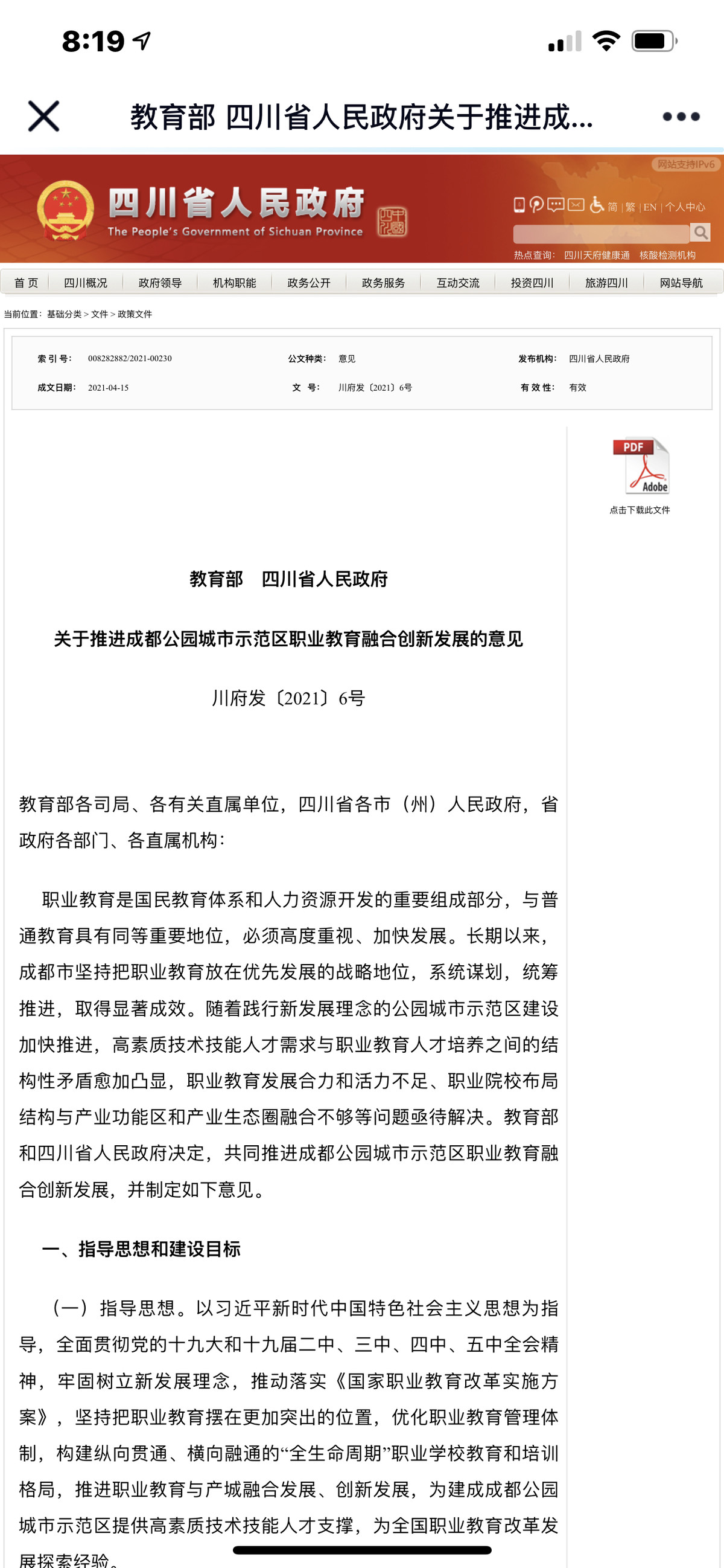 记者4月16日从四川省人民政府网站获悉,教育部和四川省人民政府出台《关于推进成都公园城市示范区职业教育融合创新发展的意见》(下简称《意见》),决定共同推进成都公园城市示范区职业教育融合创新发展。