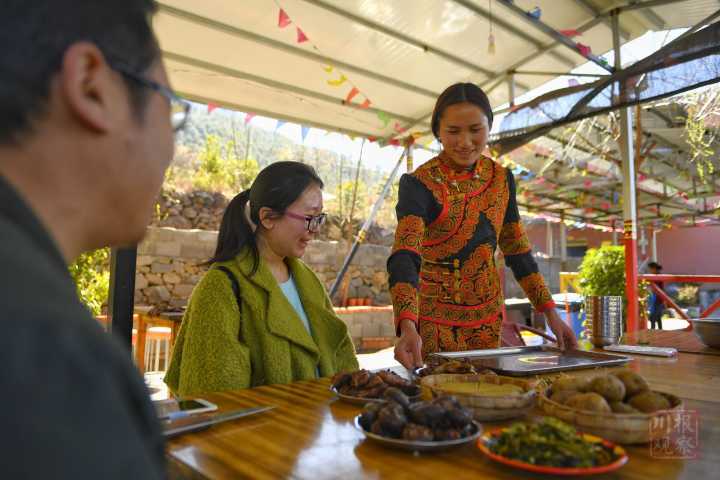 彝家乐的食材从村里其他贫困户家里收购,他还专门请了一名贫困户当服务员,每月开2000元工资,生意好的时候还要多请几个临时工帮忙。