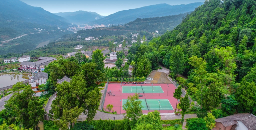 2017年6月12日,南江县正直镇长滩村的村民在家门口的山地标准网球场上挥拍打网球。尹钢 摄