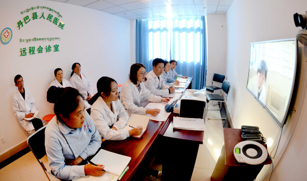 2018年10月29日,在丹巴县人民医院远程会诊室,医务人员与甘孜州甘孜人民医院医生为患者进行远程会诊 。李向雨 摄