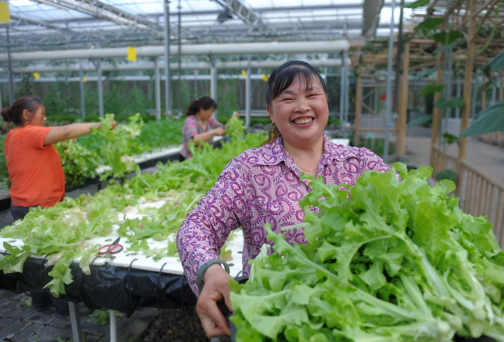 2018年4月22日,北川县维斯特现代农业科技示范园工作人员正在采摘新鲜蔬菜。衡昌辉 摄
