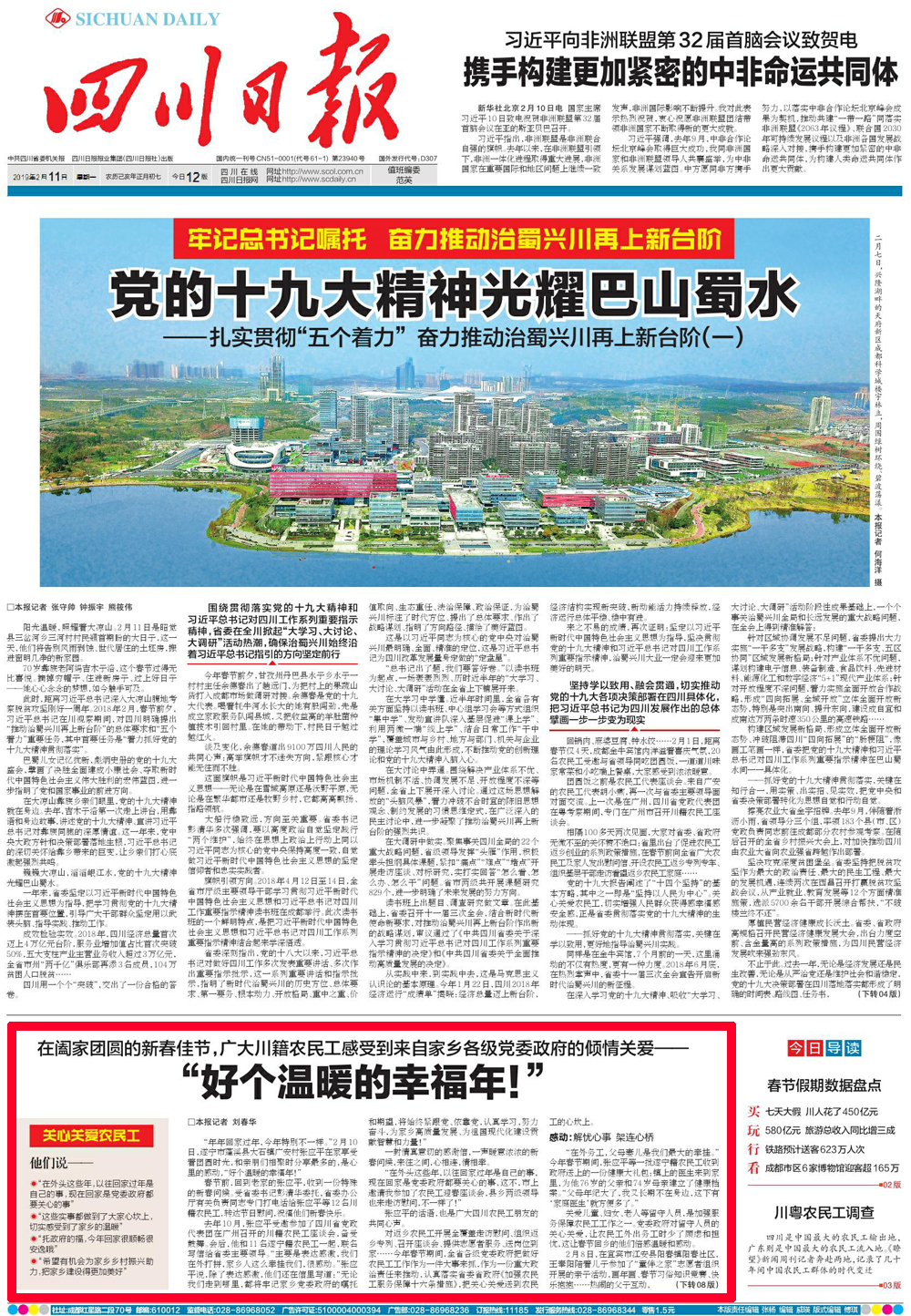 【编者按】2月11日,春节长假后的首个工作日,《四川日报》“关心关爱农民工”专栏在头版推出重磅报道,以《“好个温暖的幸福年!”》为题,生动反映我省各级党委政府在新春佳节期间,对广大川籍农民工的倾情关爱。