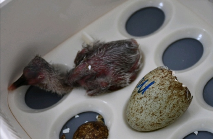 一般地,朱鹮蛋在孵化箱中孵满25天后,雏鸟会啄裂蛋壳。所以,在朱鹮“父母”自己孵化到22天左右,饲养员会将那些蛋也转移到孵化箱中孵化。蛋壳裂开后的30-40个小时,雏鸟将出壳。若不能,则进行人工干预。